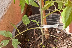 Por otro lado hay que "caparlos", esto es, eliminar todos los brotes que les van a ir saliendo de las axilas de cada hoja, tal y como se puede apreciar en la primera fotografía. Nuestro consejo es que dejéis sólo el brote principal, logrando plantas de un sólo eje.