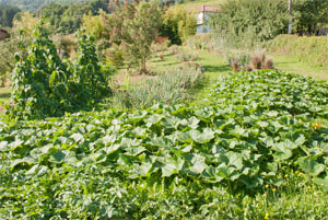 Como se puede apreciar en la primera fotografía las calabazas invaden los bancales colindantes, las plantas de patata están empezando a decrecer, señal inequívoca de que se acerca la cosecha y las cebollas rojas de Zalla empiezan a tumbar sus tallos (foto 2 detalle).