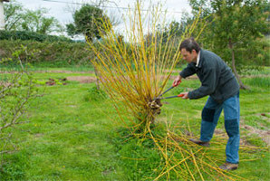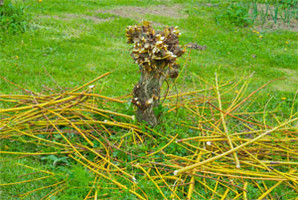 Ahora también es el momento adecuado para podar los mimbres que tengáis en el vergel. Sus ramas han aportado su color amarillo intenso durante todo el invierno, además de proporcionarnos abundantes "cuerdecillas" para entutorar viñas y kiwis. Tal y como se ve en la segunda y tercera fotografía, el tronco se poda a ras, para tener siempre rama nueva en forma de abanico y con llamativo color amarillo.