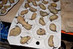 Foto 1. Patatas seleccionadas para sembrar almacenadas con claridad. Presentan brotes cortos y fuertes.