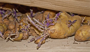 Foto 2. Patatas guardadas en oscuridad con brotes largos y débiles