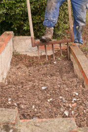 En nuestro caso partimos de un semillero antiguo, que ha estado todo el verano un poco descuidado, por lo que para limpiarlo de adventíceas (malas hierbas), pasaremos la horca de doble mango (foto 1). Esta es una herramienta muy útil, ya que permite ahuecar la tierra sin darla vuelta, algo fundamental en agricultura ecológica. Las suministramos bajo pedido a todo aquel que esté interesado. por su puesto tiene aplicación en los bancales para eliminar de manera eficaz las adventíceas y para mantener los bordes limpios de su invasión.