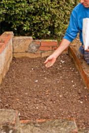 Una vez bien humedecido el sustrato, sembraremos con la mano ligeramente abierta y a poca altura del suelo (foto 4). Si usamos nuestra semilla, no hay que mezclar con arena, etc, para diluir el número de semillas, ya que las pajillas que van junto con la semilla cumplirán esa labor. Además nos sirven para "señalar" el área sembrada (foto 5).