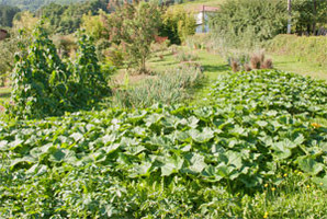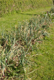 Baratzaren jarraipena egiten (1. argazkia), kalabazak leku guztiak betetzen dituzte, pataten landareak okertzen dira (uzta gertu dago) eta baita ere tipula gorriak (2. argazkia).