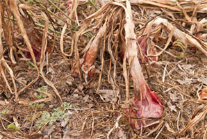Tipula gorrien uzta egiteko 1. argazkian agertzen den bezala egon behar dute. Zurtoinak guztiz lehorturik. Aurten oso onak daude. Konturatu behar nola geratzen den lurra ia ia belar txarrik gabe. Tipulak atera eta gero berriz lurra estaliko dugu belarrez.