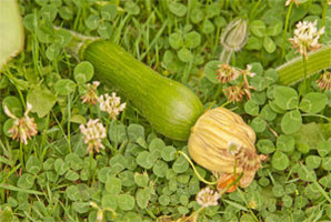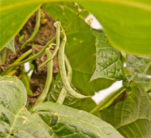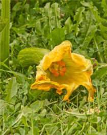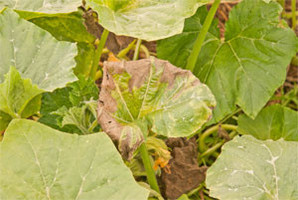 Pasaden asteburuko beroak ondorioak ekarri dute. Gure kalabazen hosto batzuk erre dira (5. argazkia), baina orokorrean beraien egoera oso ona da. Fruituak ikusten dira (6. argazkia).