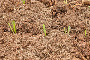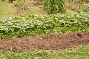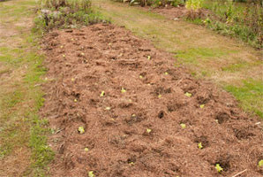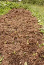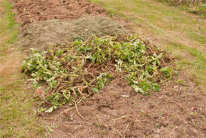 Pataten txorko batzuk ere atera ditugu (10. argazkia). Beraien zurtoinak eta hostoak libre geratu den baratzaren gainetik botako dugu (11. argazkia), eta patatak atera eta gero jarraian, porru batzuk birlandatu ditugu (12. argazkia) lurra egokitua dagoelako.
