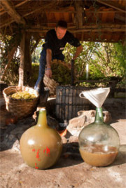 Batu eta gero dolarean trinkatzen dugu mahats zukua lortu arte (3. argazki) eta zuzenean beirazko bonbiltzarretara botatzen dugu kupelarik ez daukagulako. Leku fresko eta ilunean utziko ditugu eta 2 edo 3 egun barru irakidura hasten da. Irakadura eta gero (15 - 20 egun) estaliko ditugu eta otsaila arte ez dira ikutzen. Otsailan botiletara eta txakolin berria gozatzeko prest!